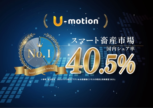 このたび、U-motionがスマート畜産市場において国内シェアNo.1の評価をいただけたことを、大変光栄に思っております。 このような評価をいただけたことは、日々現場でU-motionを活用し、改善の声を届けてくださった生産者の皆様、獣医師の先生方、そして畜産関係者の皆様と共に歩んできた成果であり、心より感謝申し上げます。
