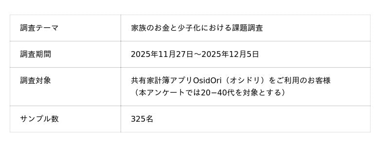 共働き世帯向け共有家計簿アプリを展開する株式会社OsidOri( https://www.osidori.co/ )は、現代の少子化における課題を浮き彫りにするため、「家族のお金と少子化における課題調査」を実施しました。