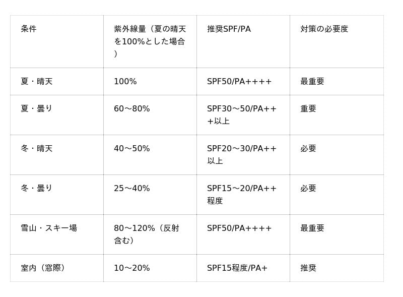 季節・天候別の紫外線量と必要な対策レベル
