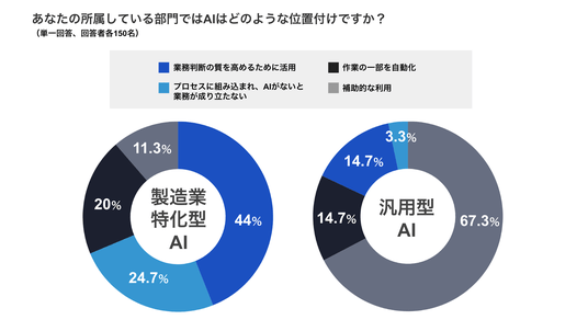 ・一方、汎用型AI利用者は67.3%が「補助的な利用」に留まり、「AIがないと業務が成り立たない」はわずか3.3%でした。