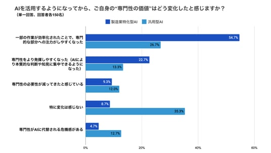 ・汎用AI利用者の最多回答は「特に変化は感じない(35.3%)」で、特化型AIこそが人の専門性を引き出す結果となりました。
