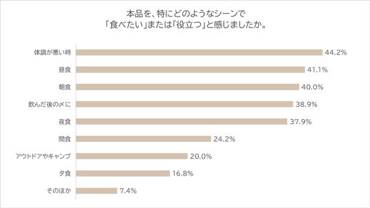 「食べたい/役立つ」と感じたシーンは、「体調が悪い時(44.2%)」がトップ。次いで「昼食(41.1%)」「朝食(40.0%)」「飲んだ後の〆(38.9%)」が続き、さっと食べたい局面でのニーズが目立ちました。