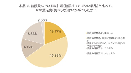 健康志向の高まりとともに「糖質オフ」食品への関心は拡大していますが、「味が薄い」「人工的な味がする」といった味への懸念の声も根強く存在します。今回、普段から甘酒を愛飲するユーザーを対象に調査を行ったところ、「糖質30%オフ」でありながら「味の満足度」で高い評価が得られました。