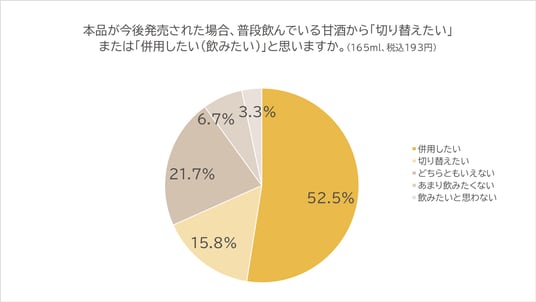 3. 【購入意向】「切り替えたい」22.1%に対し「併用したい」51.6%で、合計73.7%が購入意向あり。普段の甘酒と“使い分け”ニーズが見えた。