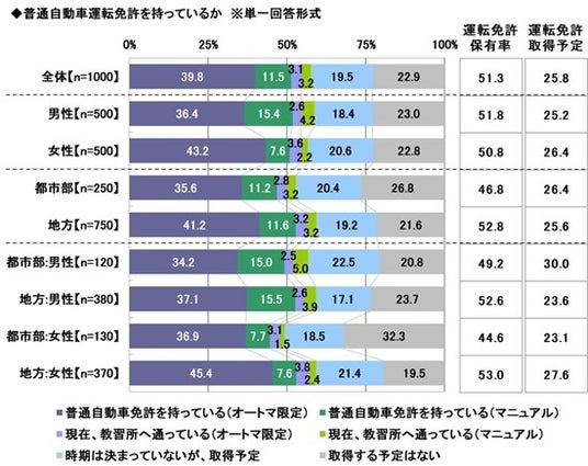 また、「現在、教習所へ通っている(オートマ限定)」は3.1%、「現在、教習所へ通っている(マニュアル)」は3.2%、「時期は決まっていないが、取得予定」は19.5%で、合計した『運転免許取得予定』は25.8%でした。