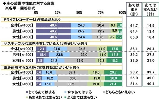 ≪ドライブレコーダーは必需品だと思う≫では『あてはまる』は64.7%、≪サステナブルな車を所有している人は格好いいと思う≫では『あてはまる』は36.1%、≪車を所有するならEV(電気自動車)がいいと思う≫では『あてはまる』は23.2%となりました。