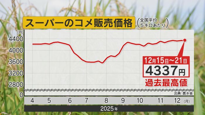 農林水産省が2025年12月下旬に発表した全国のス―パーのコメ価格は、平均で5キロ当たり4337円と過去最高値となり、依然として高騰が続いている。