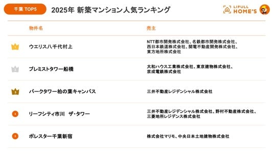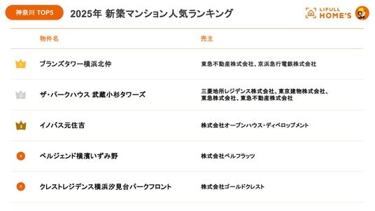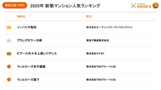 事業を通して社会課題解決に取り組む、株式会社LIFULL(本社:東京都千代田区、代表取締役社長:伊東祐司、東証プライム:2120)が運営する不動産・住宅情報サービス「LIFULL HOME'S(ライフルホームズ)」は、2026年1月6日(火)に、ページビュー数と資料請求数から算出した、「最新版!2025年 新築マンション人気ランキング」を発表しました。昨年に続き、本ランキングは2回目の発表です。