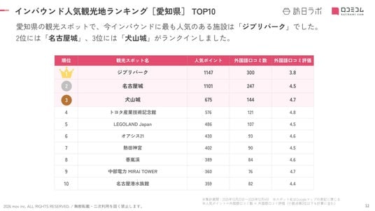 業界最大級のインバウンドビジネスメディア「訪日ラボ」及び 店舗向け集客一元化プラットフォーム「口コミコム」を運営する株式会社mov(代表取締役:渡邊 誠、本社:東京都渋谷区、以下mov)は、愛知県の観光地に寄せられた最新の口コミデータから、独自の『インバウンド人気観光地ランキング』を発表しました。
