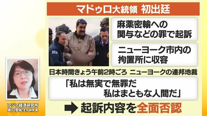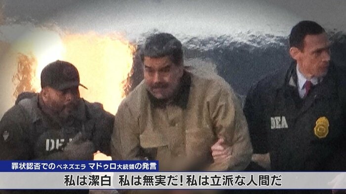 拘束されたベネズエラのマドゥロ大統領は、日本時間6日午前2時頃、ニューヨークの連邦地方裁判所に罪状認否などのために初出廷し、長年にわたる麻薬密売や機関銃の所持など4つの罪で起訴されていることについて「私は潔白、私は無実だ」と主張しました。