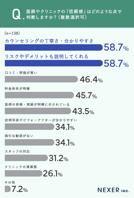 また、クリニックの信頼感を判断する基準としては「カウンセリングの丁寧さ」と「リスクやデメリットの説明」が約6割の支持を集めました。施術前にしっかりと説明を受け、納得したうえで施術に臨めることが安心感につながっています。