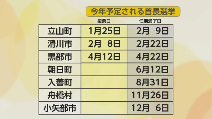 今年富山県内では、16年ぶりの選挙戦となる見込みの立山町長選や、現職の市長と元副市長が出馬する意向の黒部市長選挙など、7つの市町村長選挙が予定されている。