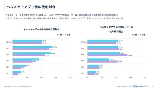 一方で、スマホユーザー全体で最も比率の高い50代男性は13.8%に対し、ヘルスケアアプリ利用ユーザーでは10.7%にとどまっています。