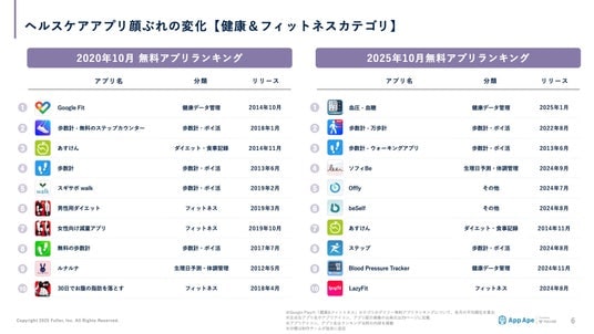 2020年と2025年の無料アプリランキングを比較すると、歩数計や健康データ管理アプリを中心に、新しいアプリの登場が目立ちます。