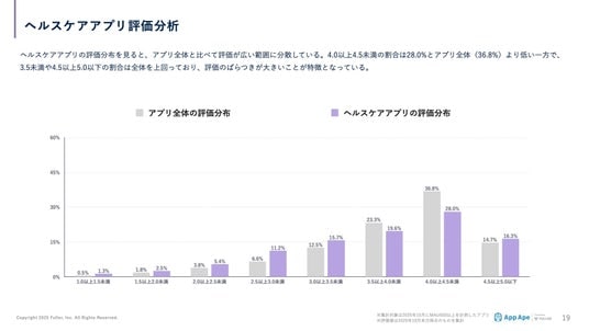 ヘルスケアアプリの評価は、アプリ全体と比べて一様ではなく、評価が分かれやすい傾向があります。中程度の評価に集中するというよりも、評価が低めのアプリと高評価のアプリが混在しており、アプリごとの差が大きいことがうかがえます