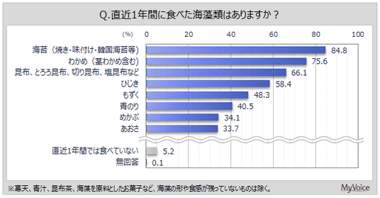 直近1年間に食べた海藻類は(複数回答)、「海苔」が84.8%、「わかめ」が75.6%、「昆布、とろろ昆布、切り昆布、塩昆布など」が66.1%です。