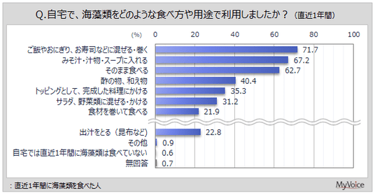 直近1年間に海藻類を食べた人に、自宅で海藻類をどのように食べるかを聞いたところ(複数回答)、「ご飯やおにぎり、お寿司などに混ぜる・巻く」が71.7%、「みそ汁・汁物・スープに入れる」が67.2%、「そのまま食べる」が62.7%です。