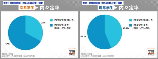 文理別にみると、理系が前月比+5.6ポイントの46.3%となり、早くも5割に近づきました。文系は前月比+8.7ポイントの伸びですが、前年同時期とほぼ同じ33.1%でした。