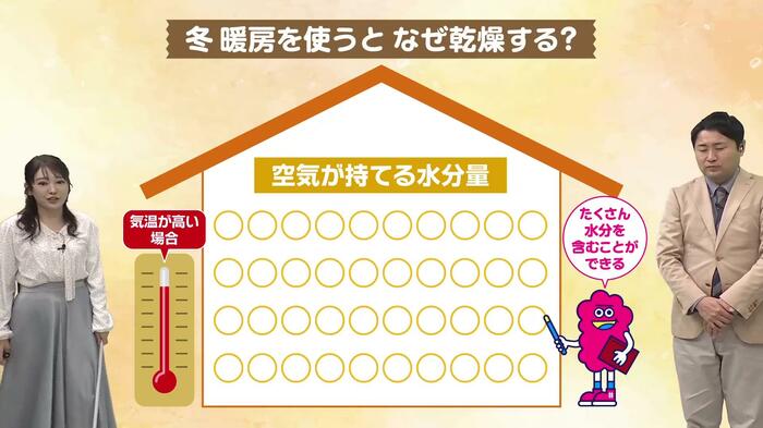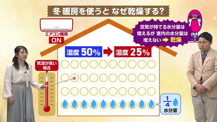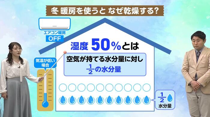 なぜ暖房で乾燥するのか、古山予報士が解説します。空気中には水分が含まれていますが、その空気が抱えることができる水分量(飽和水蒸気量)は、実は気温によって変わる性質があります。