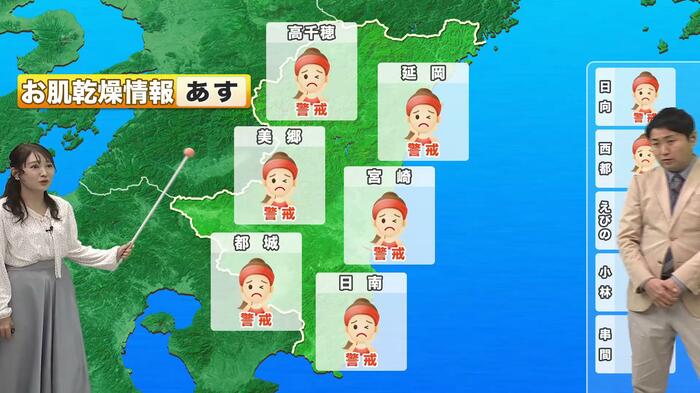 この日、宮崎県内には全域に乾燥注意報が発表されており、「お肌の乾燥情報」でも、翌日は全域で「警戒」レベルとなっていました。