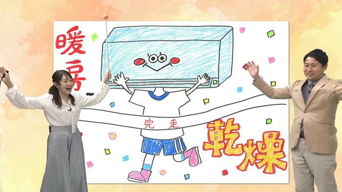 「暖房で乾燥します」ということですが、イラストでは暖房器具が体操着姿で走ってきたようで、ゴールテープを切って「完走」していました…