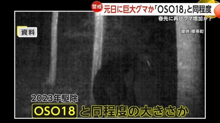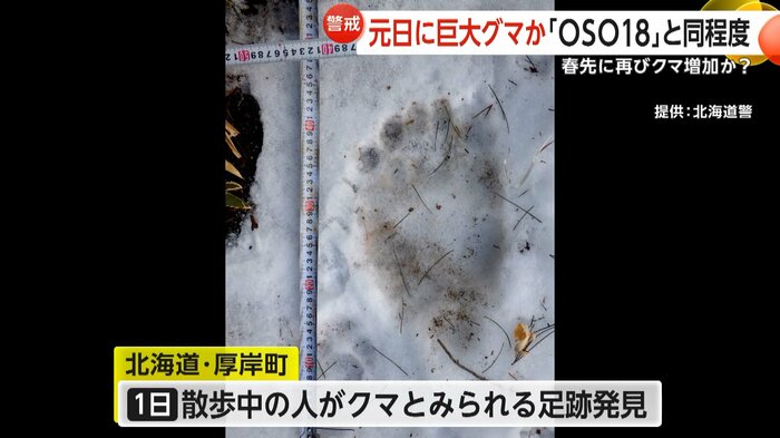 発見された足跡から、乳牛を襲うなどして2023年に駆除された巨大グマ「OSO18」と同程度の大きさとみられ、警察は住民に警戒を呼びかけている。