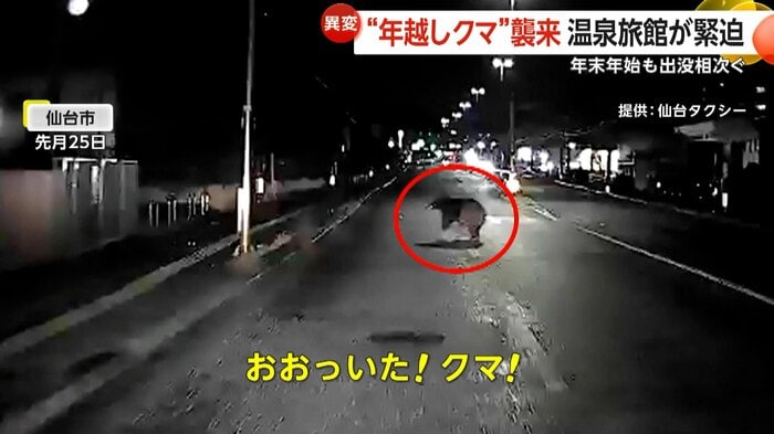 2025年12月25日、クリスマスの深夜に仙台市を走行するタクシーのドライブレコーダーが、クマの姿を捉えた。