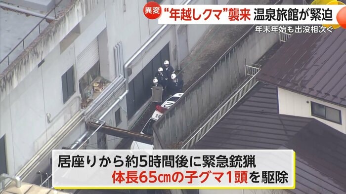 営業中だった温泉旅館の施設にクマが侵入した。居座りから約5時間後に緊急銃猟を行い、体長65cmの子グマ1頭が駆除された。