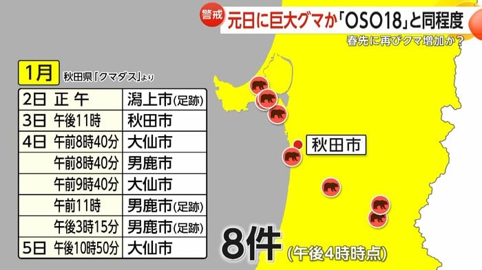 一方、クマによる人的被害などが相次いだ秋田県では、2026年に入っても連日のように市街地での目撃情報が報告され、すでに8件に上っている(6日午後4時時点、足跡も含む)。