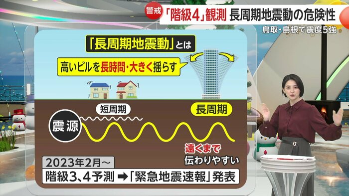 最大震度5強を観測した6日の地震では、各地で長周期地震動を観測した。鳥取県西部では最も揺れが大きい「階級4」を能登半島地震以来2年ぶりに観測したが、この長周期地震動は一体どういうものなのか。また、どういった行動が求められるのか、地震学が専門の東京科学大学・中島淳一教授に聞いた。