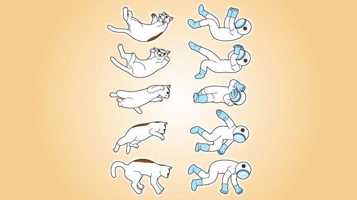 宇宙飛行士も猫の空中立位反射を応用宇宙で人間が体の向きを変えるのには、猫の空中立位反射の分析が役に立ちました。宇宙飛行士は体の向きを変えるとき、猫の動きを真似ています。猫は宇宙開発にも貢献していたのです。