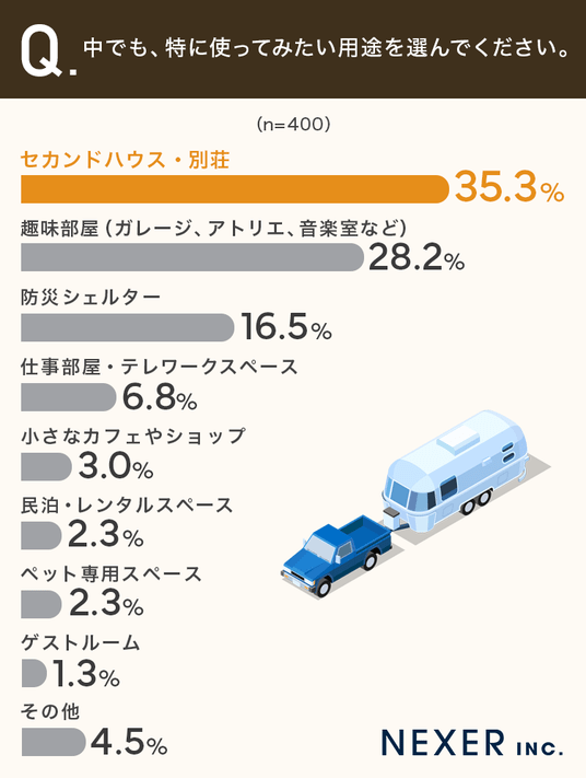 この結果から、トレーラーハウスには「日常から少し離れて過ごす空間」としてのニーズが高いことがうかがえます。