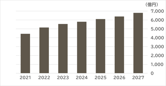 2024年の市場規模は、約5,800億円であったと推定され、今後も緩やかな成長が続き、2027年にはさらに拡大すると予測する。