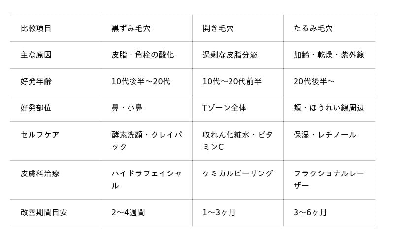 毛穴タイプ別の原因と対策比較