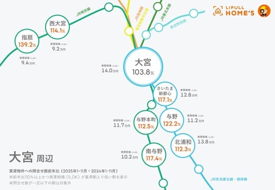 集計対象:LIFULL HOME'Sに掲載された賃貸物件集計方法:賃貸物件への問合せ数の駅別に集計し、前年同期間と比較(2025年1-11月÷2024年1-11月)