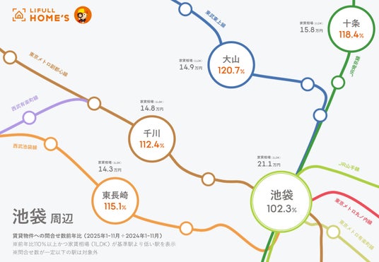 9路線が乗り入れ、賃貸物件への問合せ数を集計した「2025年 LIFULL HOME'S みんなが探した!借りて住みたい街ランキング(首都圏版)」でも10位にランクインしている人気の駅ターミナル駅「池袋」で「ずらし駅」の傾向が見られました。「池袋」では問合せ数前年比が102.3%にとどまる一方、東武東上線「大山」、JR埼京線「十条」、西武池袋線「東長崎」、東京メトロ副都心線「千川」の4駅で前年比110%を超えており、どの駅も急行などの速達列車が停車しないが、「池袋」まで約5分程度でアクセスできるという共通点があります。また、家賃相場(1LDK)では、「池袋」の21.1万円に対して、「十条」が15.8万円(-5.3万円)、「大山」が14.9万円(-6.2万円)、「千川」が14.8万円(-6.3万円)、「東長崎」が14.3万円(-6.8万円)で2-3駅ずらすだけで、5-6万円ほど生活費を抑えることができます。