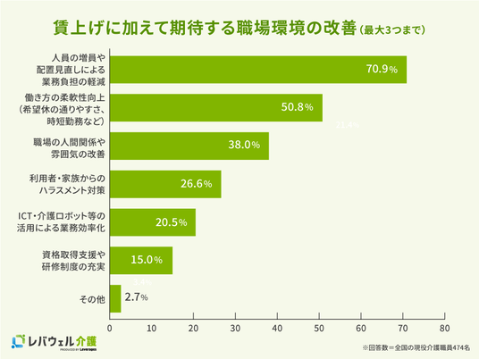 賃上げに加えて期待する職場環境の改善について聞いたところ、「人員の増員や配置見直しによる業務負担の軽減」が70.9%で最多となりました。次いで、「働き方の柔軟性の向上(50.8%)」「職場の人間関係や雰囲気の改善(38.0%)」も高い割合を占めています。これらの結果から、介護現場が求める処遇改善は、賃金の引き上げだけにとどまらず、人材確保による業務負担の適正化をはじめとした、働き続けやすい職場環境の整備が重要であることが明らかになりました。