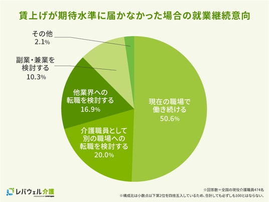 賃上げが自身の期待する水準に届かなかった場合の今後の働き方については、「現在の職場で働き続ける」が50.6%と約半数を占めました。その一方で、「介護職員として別の職場へ転職を検討(20.0%)」「他業界への転職を検討(16.9%)」が合計36.9%と約4割にのぼり、賃上げの水準次第では現職を離れる可能性を視野に入れる層も一定数存在することが分かりました。賃上げへの期待と、その実現の度合いが、今後の就業継続や人材の定着・流動に影響を与える可能性が示されています。