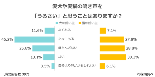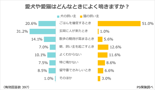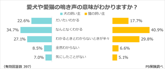 ペット保険「PS保険」を提供するペットメディカルサポート株式会社(本社:東京都港区、代表取締役社長:米満 明仁)はこの度、全国の20~69歳の犬や猫の飼い主1,876名(有効回答数397)にアンケートを実施し、「愛犬や愛猫の鳴き声」に関する実態を調査しました。その結果を、詳しく紹介いたします。