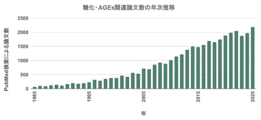 近年、AGEs(終末糖化産物)に関する論文数が急増している背景には、老化と慢性疾患を横断的につなぐ共通メカニズムとして、その重要性が明らかになってきたことが挙げられます。