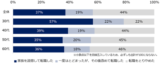 一方で、家族からの転職反対を受けた方に最終的な判断を伺うと、37%が「家族を説得して転職した」、19%が「一度はとどまったが、その後改めて転職した」と回答。「転職をとりやめた」と回答した方が44%で最多になりました。在籍企業からの引きとめよりも、家族の反対が、転職の意思決定に大きな影響を与えていることがうかがえます。それぞれ、最終的な判断に至った理由やエピソードも紹介します。
