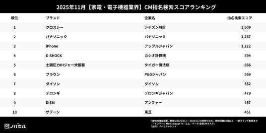 あらゆるテレビCMの指名検索スコアが可視化できる「ノバセルトレンド」を用いて、2025年11月の「家電・電子機器業界(*¹)」における指名検索スコア順テレビCMランキングの上位10位をご紹介します。