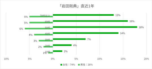 直近1年間における「岩田剛典」の検索ユーザー層は、40代以上の女性が中心です。男女比はおよそ3対7で、11月にプロモーションを行った「DISM 美顔器」に近い傾向を示しています。 本来、DISMは30代男性を主要ターゲットとしていますが、現在36歳の岩田さんを起用したことで検索層が岩田さんの支持層である40代以降へと拡大。結果として、より幅広い層へのアプローチに成功しました。