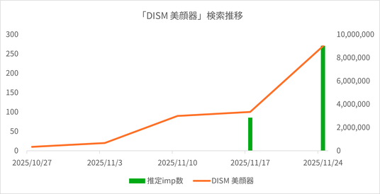 「DISM 美顔器」の検索推移を確認すると、CM公開が始まった11月10日週に検索数が急増しました。翌11月17日週のCM放映開始時はほぼ横ばいでしたが、次週には放映量の増加に伴い、検索数は再び大きく伸びています。