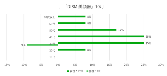 10月と11月の「DISM 美顔器」検索ユーザーを比較すると、11月は男性の検索割合が上昇し、男女ともに50代の比率が高まりました。もともと関心の高かった30代男性や30~40代女性を含め、10代女性を除く全世代で検索数が大幅に底上げされました。その結果、構成比以上に実数が伸びており、もともと関心の高かった30代男性や30~40代女性を含め、10代女性を除く全世代で検索数が大幅に底上げされました。