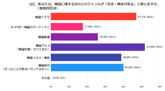 2.あなたは、韓国に関する次のどのジャンルが「好き・興味がある」と感じますか。(回答対象者:Q1で「興味がある」と回答した人)※複数回答可