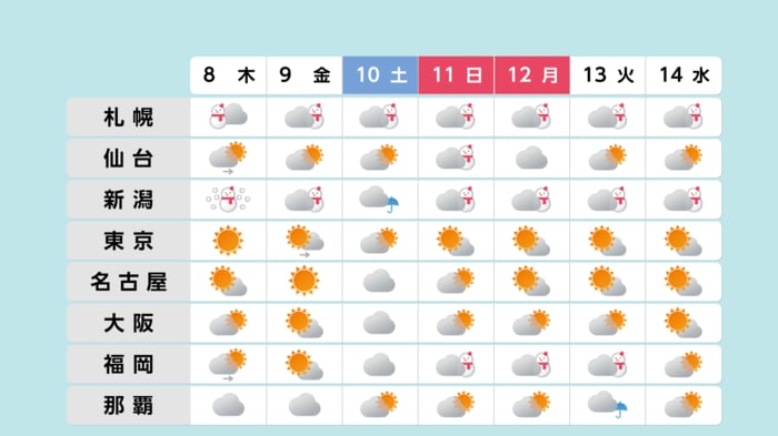 11日から12日にかけては晴れる太平洋側も含めて全国的に季節風が強まり、寒さも厳しくなる。
