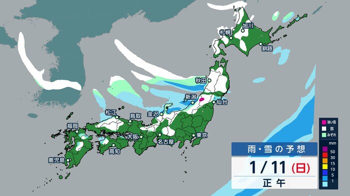 翌12日月曜日「成人の日」も九州から北海道にかけて引き続き広い範囲で雪が降り、日本海側を中心に警報級大雪のおそれが続く。雪が予想される地域の「二十歳の集い」は足元に注意してほしい。