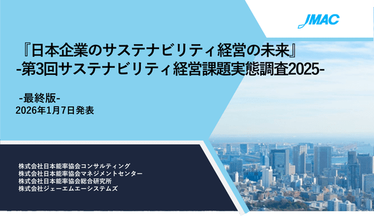 株式会社日本能率協会コンサルティング(本社:東京都港区・代表取締役社長:大谷羊平、以下JMAC)、株式会社日本能率協会マネジメントセンター(本社:東京都中央区・代表取締役社長:張士洛、以下JMAM)、株式会社日本能率協会総合研究所(本社:東京都港区・代表取締役社長:譲原 正昭、以下JMAR)、株式会社ジェーエムエーシステムズ(本社:東京都港区・代表取締役社長:坂倉 猛、以下JMAS)は、『サステナビリティ経営』の進展状況を把握するために、2025年7月~9月の期間で『サステナビリティ経営課題実態調査』を実施をいたしました。このほど本調査の最終報告がまとまりましたのでご報告いたします。