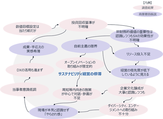 今回サステナビリティ経営が停滞する要因として、調査結果に基づき、要因仮説を以下のように考察いたしました。